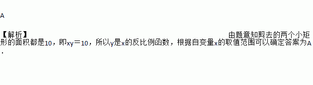 一张正方形的纸片,剪去两个一样的小矩形得到一个E”图案,如图所示,设小矩形的长和宽分别为x,y,剪去部分的面积为20,若2≤x≤10,则y与x的函数图象是( )