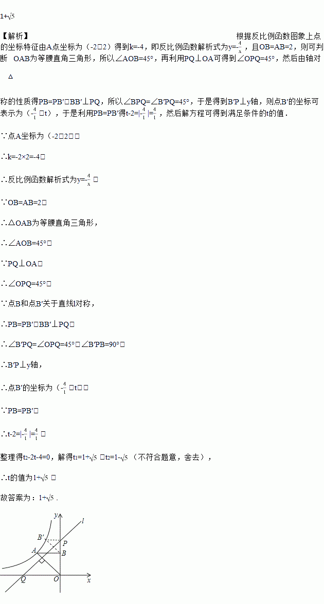 (x<0)的图象经过点A(﹣2,2),过点A作AB⊥y轴,垂足为B,在y轴的正半轴上取一点P(0,t),过点P作直线OA的垂线l,以直线l为对称轴,点B经轴对称变换得到的点B′在此反比例函数的图象上,则t的值是________.