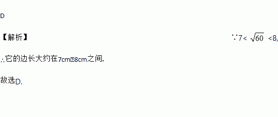D 【解析】∵7< <8, ∴它的边长大约在7cm~8cm之间. 故选D.