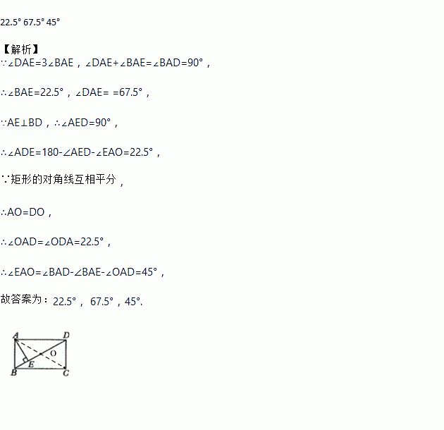 如图所示,矩形ABCD中,AE⊥BD于E,∠DAE=3∠BAE,则∠BAE=_____,∠EAD=_____,∠EAC=_____.