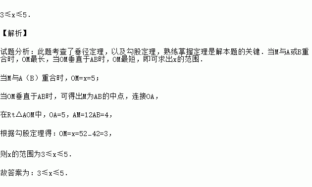 如图,⊙O的半径为5,弦AB=8,动点M在弦AB上运动(可运动至A和B),设OM=x,则x的取值范围是 .
