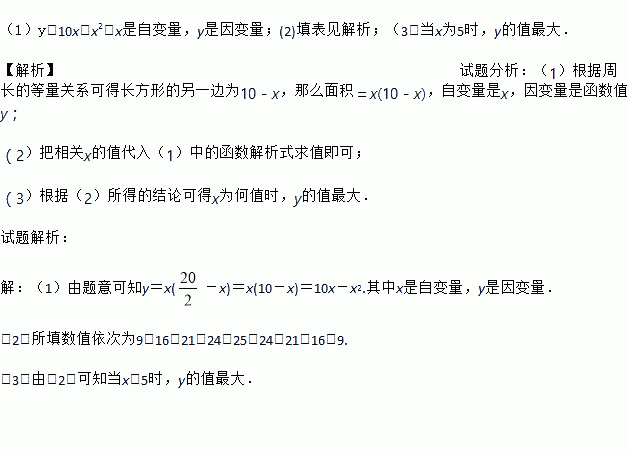 (1)y=10x-x2,x是自变量,y是因变量;(2)填表见解析;(3)当x为5时,y的值最大. 【解析】试题分析:(1)根据周长的等量关系可得长方形的另一边为10-x,那么面积=x(10-x),自变量是x,因变量是函数值y; (2)把相关x的值代入(1)中的函数解析式求值即可; (3)根据(2)所得的结论可得x为何值时,y的值最大. 试题解析: 【解析】 (1)由...