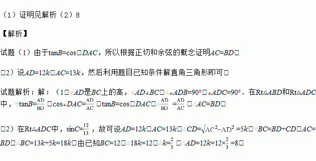 如图,在△ABC中,AD是BC上的高,tan∠B=cos∠DAC,