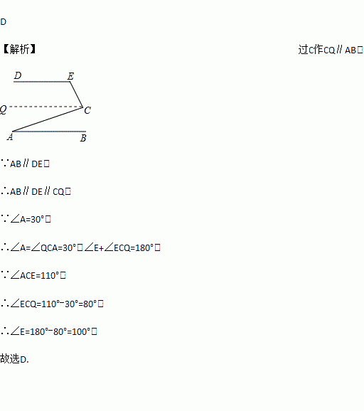 如图,玲玲在美术课上用丝线绣成了一个“2”,AB∥DE,∠A=30°,∠ACE=110°,则∠E的度数为( )
