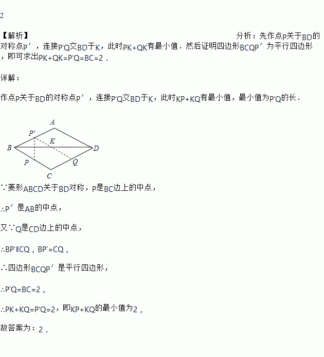 如图,点P、Q是边长为2的菱形ABCD中两边BC和CD的中点,K是BD上一动点,则KP+KQ的最小值为________.