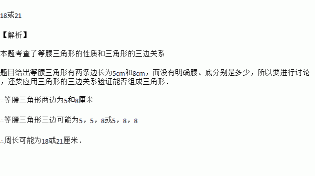 一个等腰三角形有两边分别为5cm和8cm,则周长是 厘米.