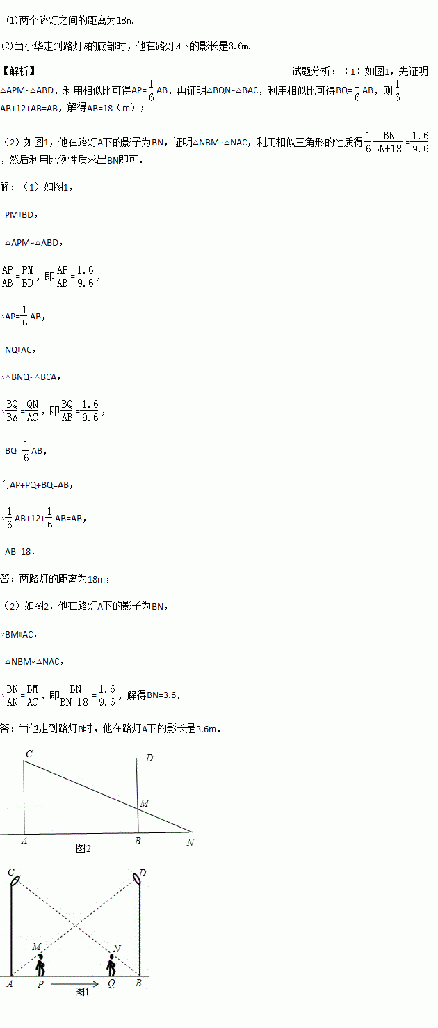如图,小华在晚上由路灯A走向路灯B.当他走到点P时,发现他身后影子的顶部刚好接触到路灯A的底部;当他向前再步行12m到达点Q时,发现他身前影子的顶部刚好接触到路灯B的底部.已知小华的身高是1.6m,两个路灯的高度都是9.6m,且AP=QB.