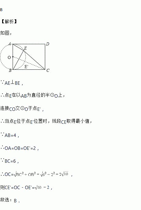 如图,在矩形ABCD中,AB=4,BC=6,E是矩形内部的一个动点,且AE⊥BE,则线段CE的最小值为( )