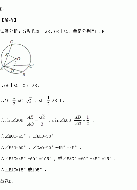 D. 【解析】 试题分析:分别作OD⊥AB,OE⊥AC,垂足分别是D、E. ∵OE⊥AC,OD⊥AB, ∴AE=AC=,AD=AB=1, ∴sin∠AOE=,sin∠AOD=, ∴∠AOE=45°,∠AOD=30°, ∴∠BAO=60°,∠CAO=90°-45°=45°, ∴∠BAC=45°+60°=105°,或∠BAC′=60°-45°=15°. ...