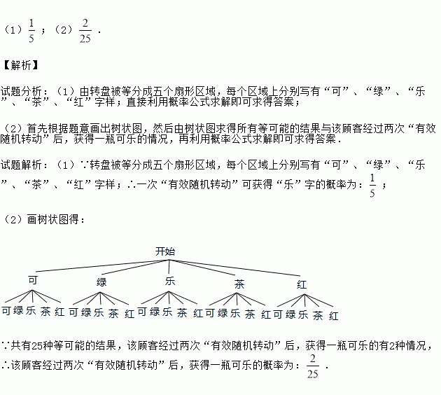 某超市为了答谢顾客,凡在本超市购物的顾客,均可凭购物小票参与抽奖活动,奖品是三种瓶装饮料,它们分别是:绿茶(500ml)、红茶(500ml)和可乐(600ml),抽奖规则如下:①如图,是一个材质均匀可自由转动的转盘,转盘被等分成五个扇形区域,每个区域上分别写有“可”、“绿”、“乐”、“茶”、“红”字样;②参与一次抽奖活动的顾客可进行两次“有效随机转动”(当转动转盘,转盘停止后,可获得指针所指区域的字样,我们称这次转动为一次“有效随机转动”);③假设顾客转动转盘,转盘停止后,指针指向两区域的边界,顾客可以再转动转盘,直到转动为一次“有效随机转动”;④当顾客完成一次抽奖活动后,记下两次指针所指区域的两个字,只要这两个字和奖品名称的两个字相同(与字的顺序无关),便可获得相应奖品一瓶;不相同时,不能获得任何奖品.