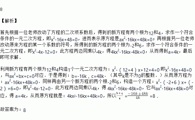 已知关于x的二次方程ax2+bx+c=0没有实数根,一位老师改动了方程的二次项系数后,得到的新方程有两个根为12和4;另一位老师改动原来方程的某一个系数的符号,所得到的新方程的两个根为-2和6,那么