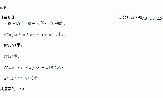如图,滑竿在机械槽内运动,∠ACB为直角,已知滑竿AB长2.5米,顶点A在AC上滑动,量得滑竿下端B距C点的距离为1.5米,当端点B向右移动0.5米时,滑竿顶端A下滑________米.
