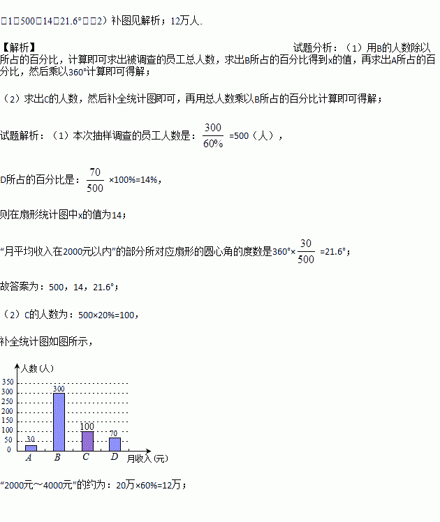 (1)本次抽样调查的员工有 .人,在扇形统计图中x 的值为 .,表示“月平均收入在2000元以内”的部分所对应扇形的圆心角的度数是 .;