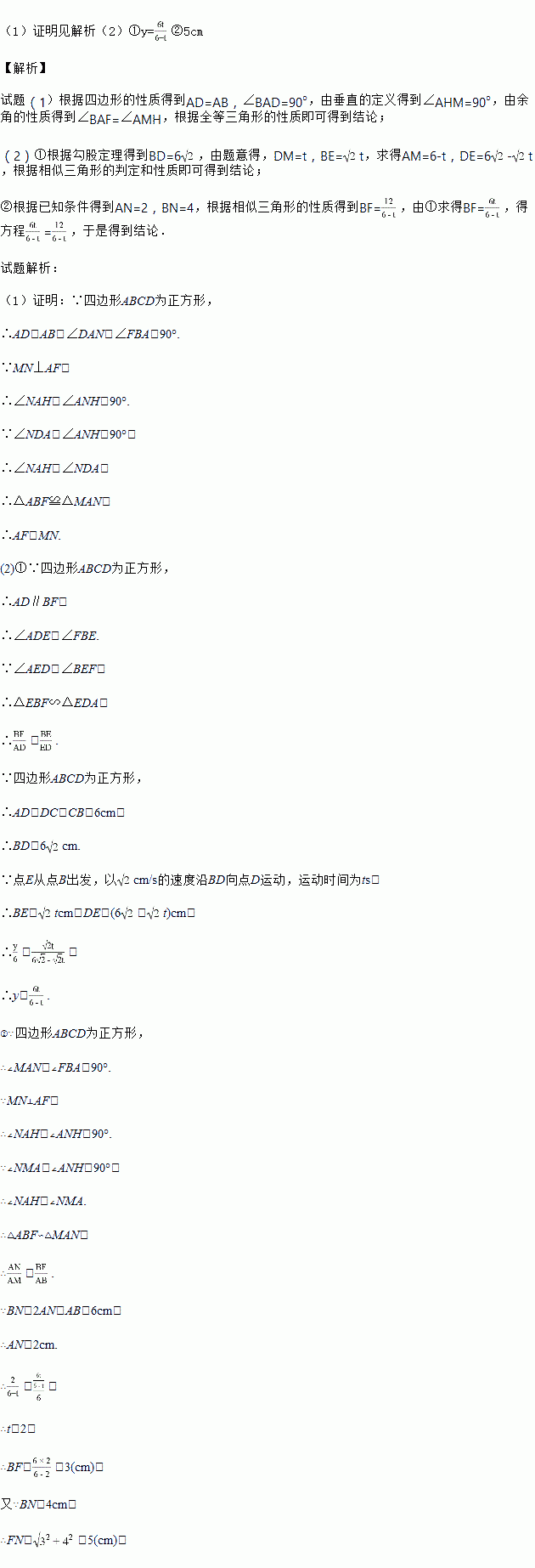 正方形ABCD的边长为6cm,点E,M分别是线段BD,AD上的动点,连接AE并延长,交边BC于F,过M作MN⊥AF,垂足为H,交边AB于点N.