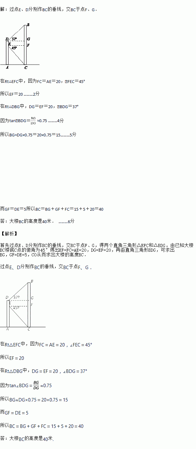 如图,某同学在大楼AD的观光电梯中的E点测得大楼BC楼底C点的俯角为45°,此时该同学距地面高度AE为20米,电梯再上升5米到达D点,此时测得大楼BC楼顶B点的仰角为37°,求大楼的高度BC.(参考数据:sin37°≈0.60,cos37°≈0.80,tan37°≈0.75).