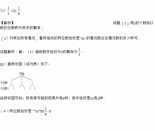 (2)随机抽取一张作为十位上的数字(不放回),再抽取一张作为个位上的数字,通过列表 或画树状图求所组成的两位数恰好是“51”的概率.