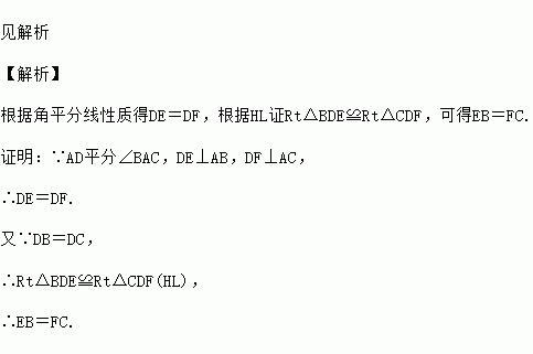 如图,AD平分∠BAC,DE⊥AB于点E,DF⊥AC于点F,且DB=DC.求证:EB=FC.