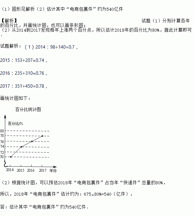 (2)若2018年“快递件”总量将达到675亿件,请估计其中“电商包裹件”约为多少亿件?