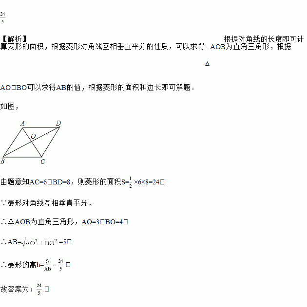 若菱形的两条对角线的长分别为6、8,则菱形的高为__________