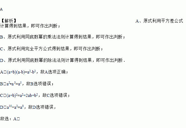A. (a+b)(a-b)=a2-b2 B. a2·a3=a6 C. (a+b)2=a2+b2 D. a10÷a2=a5