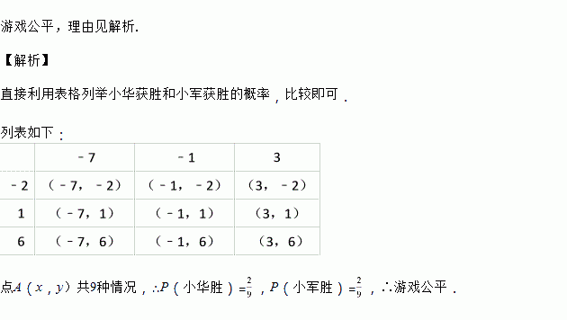 小华和小军做摸卡片游戏,规则如下:甲、乙两个袋中均装有三张除所标数值外完全相同的卡片,甲袋中的三张卡片上所标有的三个数值为-7,-1,3.乙袋中的三张卡片所标的数值为-2,1,6.先从甲袋中随机取出一张卡片,用x表示取出的卡片上的数值,再从乙袋中随机取出一张卡片,用y表示取出卡片上的数值,把x、y分别作为点A的横坐标和纵坐标.若点A在第一象限,则小华胜,若点A在第三象限则小军胜.这个游戏对双方公平吗?请说明理由.