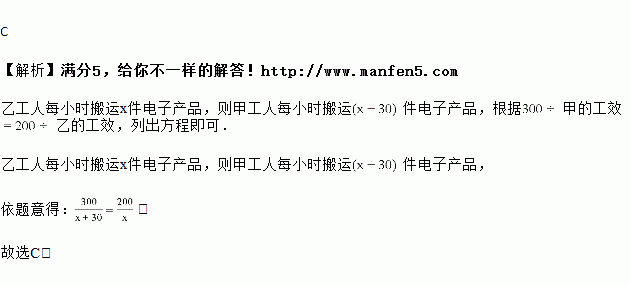 某工厂新引进一批电子产品,甲工人比乙工人每小时多搬运30件电子产品,已知甲工人搬运300件电子产品所用的时间与乙工人搬运200件电子产品所用的时间相同若设乙工人每小时搬运x件电子产品,可列方程为![]()