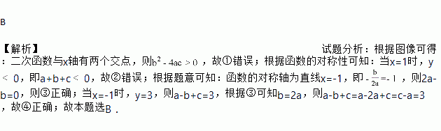 如图所示,抛物线y=ax2+bx+c的顶点为B(–1,3),与x轴的交点A在点(–3,0)和(–2,0)之间,以下结论:①b2–4ac=0;②a+b+c>0;③2a–b=0;④c–a=3.其中正确的有( )