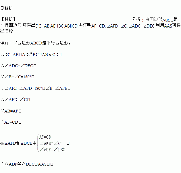 在?ABCD中,E是BC边上一点,F为DE上一点,若∠B=∠AFE,AB=AF.求证:△ADF≌△DEC.