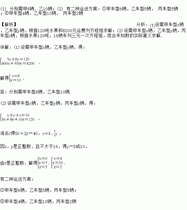 (1)若全部水果都用甲、乙两种车型来运送,需运费8200元,问分别需甲、乙两种车型各几辆?