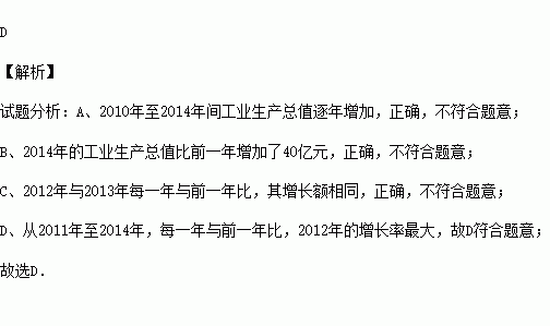 如图,是根据某市2010年至2014年工业生产总值绘制的折线统计图,观察统计图获得以下信息,其中信息判断错误的是( )