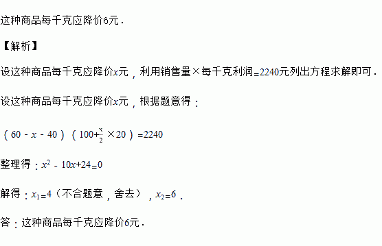 (题文)某商场销售某种商品,进价为每千克40元,按每千克60元出售,平均每天可售出100千克.后来经过市场调查,单价每降低2元,则平均每天的销售量可增加20千克.若该商场销售这种商品平均每天获利2240元,并且为尽可能让利于顾客,赢得市场,那么这种商品每千克应降价多少元?