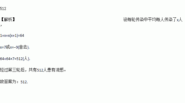 有一人患了流感,经过两轮传染后共有64人患了流感,若每轮传染中平均每个人传染的人数相同,那么第三轮过后,共有__人患有流感.