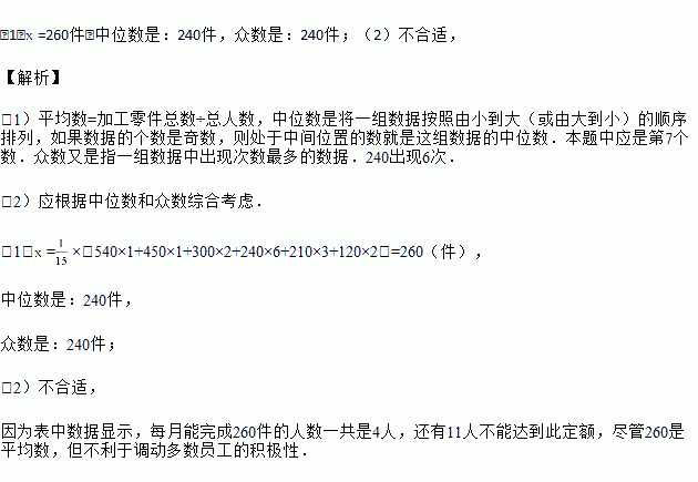 (1)求出这15人该月加工零件数的平均数并直接写出中位数和众数;
