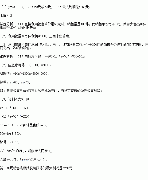 £¨3£©ÔÚ£¨1£©ÎÊÌõ¼þÏ£¬Èô¸ÃÉ̳¡ÒªÍê³É²»ÉÙÓÚ350¼þµÄÏúÊÛÈÎÎñ£¬ÇóÉ̳¡ÏúÊÛ¸ÃÆ·ÅÆ·þ×°»ñµÃµÄ×î´óÀûÈóÊǶàÉÙ£¿