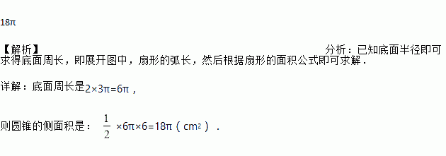已知圆锥的底半径为3cm,母线长为6cm,则圆锥的侧面积是__cm2.