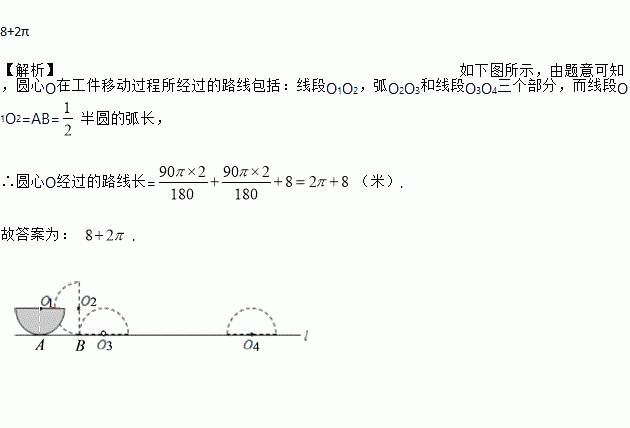 已知一个半圆形工件,未搬动前如图,直径平行于地面放置,搬动时为了保护圆弧部分不受损伤,先将半圆作如图所示的无滑动翻转,使它的直径紧贴地面,再将它沿地面平移8米,半圆的直径为4米,则圆心O所经过的路线长是__米