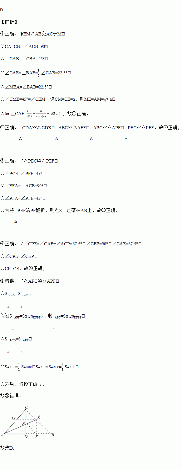 如图,将一个等腰Rt△ABC对折,使∠A与∠B重合,展开后得折痕CD,再将∠A折叠,使C落在AB上的点F处,展开后,折痕AE交CD于点P,连接PF、EF,下列结论:①tan∠CAE=