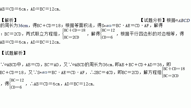 已知?ABCD的周长为36cm,过点A作AE⊥BC,AF⊥CD,垂足分别为E、F.若AE=2cm,AF=4cm.求?ABCD的各边长.