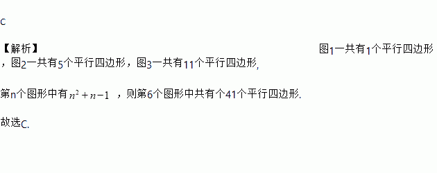 下面图形都是由同样大小的平行四边形按一定的规律组成,其中,图1一共有1个平行四边形,图2一共有5个平行四边形,图3一共有11个平行四边形,…则图6中平行四边形的个数为( )