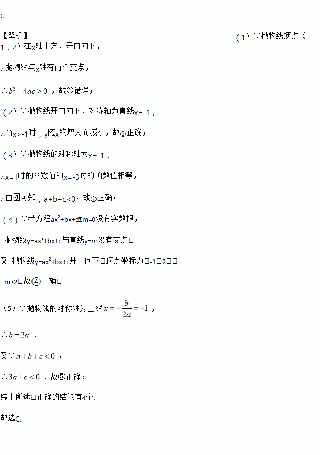 C 【解析】(1)∵抛物线顶点(-1,2)在x轴上方,开口向下, ∴抛物线与x轴有两个交点, ∴,故①错误; (2)∵抛物线开口向下,对称轴为直线x=-1, ∴当x>-1时,y随x的增大而减小,故②正确; (3)∵抛物线的对称轴为x=-1, ∴x=1时的函数值和x=-3时的函数值相等, ∴由图可知,a+b+c<0,故③正确; (4)∵若方程ax...