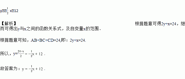 李大爷要围成一个矩形菜园,菜园的一边利用足够长的墙,用篱笆围成的另外三边总长度恰好为24米.要围成的菜园是如图所示的长方形ABCD,设BC边的长为x米,AB边的长为y米,则y与x之间的函数关系式是_________________.