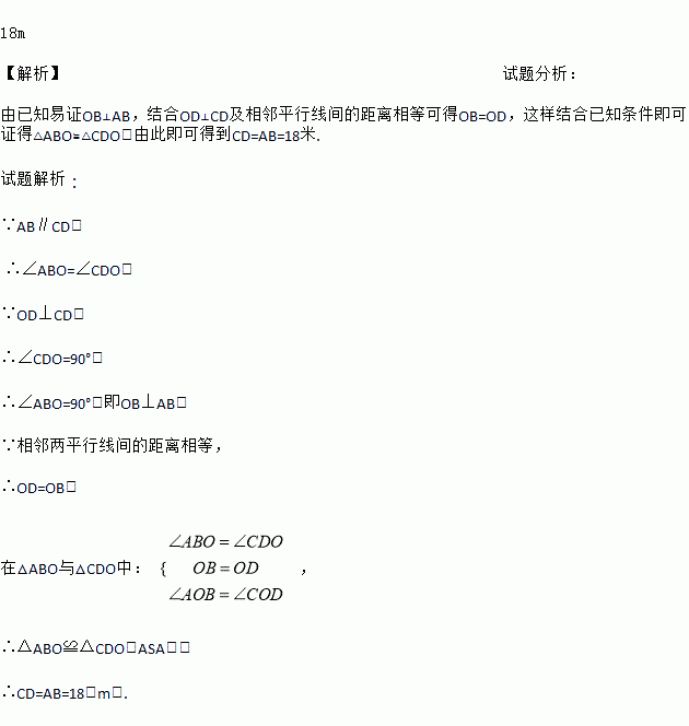 杨阳同学沿一段笔直的人行道行走,在由A步行到达B处的过程中,通过隔离带的空隙O,刚好浏览完对面人行道宣传墙上的社会主义核心价值观标语,其具体信息汇集如下:如图,AB∥OH∥CD,相邻的平行线间的距离相等,AC,BD相交于O,OD⊥CD.垂足为D,已知AB=18米,请根据上述信息求标语CD的长度.