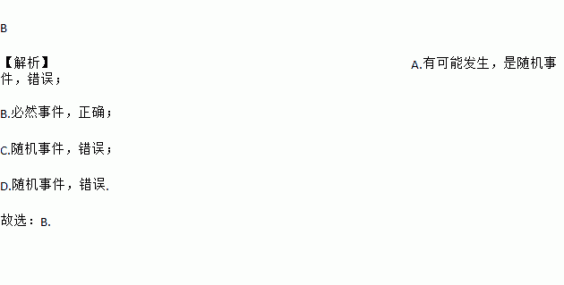 B 【解析】A.有可能发生,是随机事件,错误; B.必然事件,正确; C.随机事件,错误; D.随机事件,错误. 故选:B.