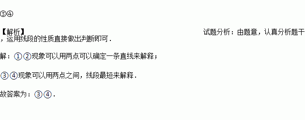 下列四个生活、生产现象:①用两个钉子就可以把木条固定在墙上;②植树时,只要定出两棵树的位置,就能确定同一行树所在的直线;③从A地到B地架设电线,总是尽可能沿着线段AB架设;④把弯曲的公路改直,就能缩短路程.其中可用“两点之间,线段最短”来解释的现象是_______(填序号).