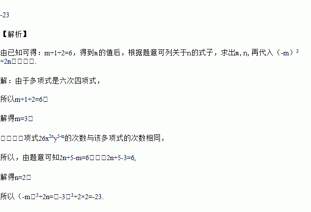 已知多项式5xm+1y2+2xy2-4x3+1是六次四项式,单项式26x2ny5-m的次数与该多项式的次数相同,