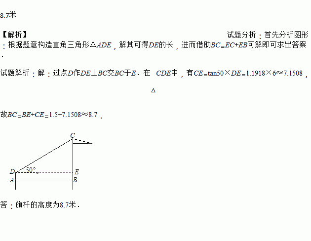 如图,在离旗杆6米的A处,用测角仪测得旗杆顶端C的仰角为50度,已知测角仪高AD=1.5米,求旗杆的高度.(tan 50°=1.1918,sin50°=0.7660,结果精确到0.1米)