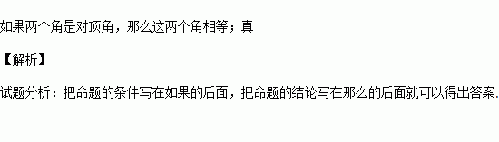 将命题“对顶角相等”改写成“如果…那么…”的形式: .这是一个 命题.(填“真”或“假”)