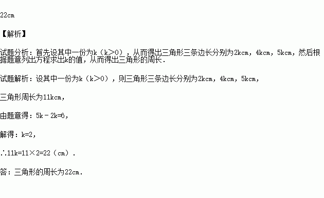 一个三角形3条边长的比是2:4:5,最长的一条边比最短的一条边长6cm,求这个三角形的周长.