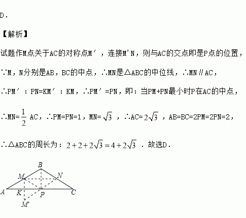 在等腰三角形ABC中,∠ABC=120°,点P是底边BC上一个动点,点M、N分别是AB、BC的中点,若PM+PN的最小值为2,则△ABC的周长是( )
