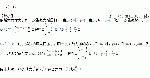 已知一次函数y=kx+b,当0≤x≤2时,对应的函数值y的取值范围是﹣2≤y≤4,则kb的值为______.
